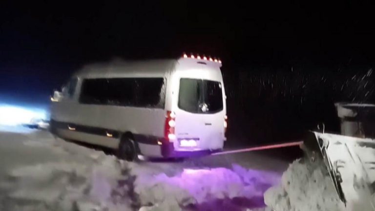 Kutlamadan dönen öğretmenlerin bulunduğu minibüs karda mahsur kaldı